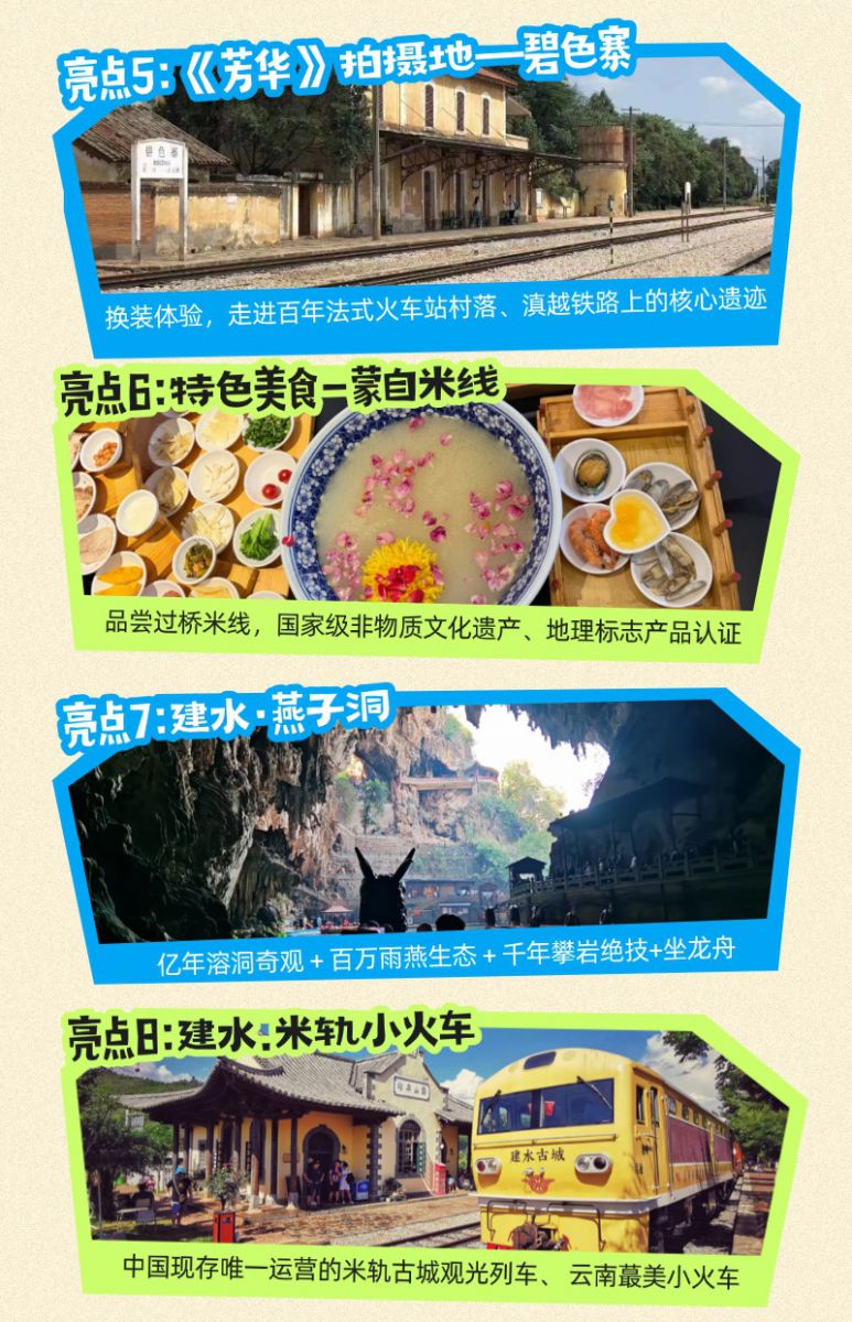 【门票】:弥勒东风韵、普者黑水路套票+泛舟体验、玫瑰庄园+鲜花饼+浑水摸鱼(仅限儿童)、碧色寨换装(仅限儿童)、米轨小火车单程票、文庙、朱家花园、燕子洞、澄江化石博物馆;
